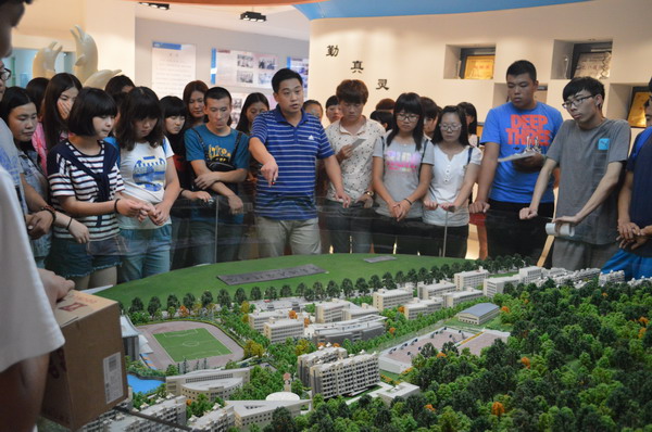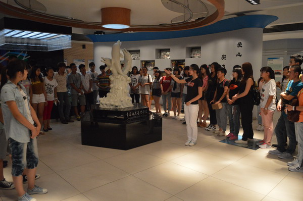 在海斯曼讲解员的引领下,同学们认真参观各个展区,当看到可爱的公司吉祥物——“海豚博士”时,忍不住伸手抚摸;看到漂亮的公司全景沙盘时,他们热切地询问各楼座的名称和功能;驻足荣誉墙前,同学们对公司获得的一次次国家级、省级荣誉惊叹不已;在公司历史沿革展区,同学们详细了解了公司69年的光辉历程。