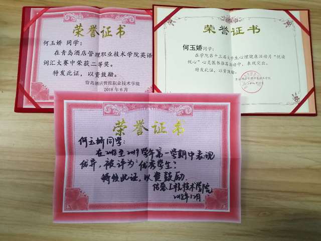 她努力学习专业知识,学习成绩在班级名列前茅。在2017-2018学年度中学习成绩和综合素质测评成绩均班级第一,并分别获得校级奖学金和国家励志奖学金以及“校级优秀员工”称号。通过平时优异表现,得到领导老师的一致好评,并在公司“小白杨故事会”中被评为“先进明星”人物。除此之外,她积极参与公司组织的各项活动,在“英语词汇大赛”中荣获“二等奖”。在第十三届老员工心理活动月中荣获“悦读悦心奖”等。