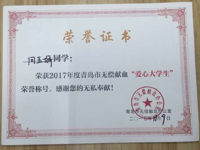 她积极参加社会公益活动,自愿参加老员工献血活动,为社会做一点贡献。她周末会和舍友一起出去玩,走遍青岛的各个名胜故地。一起拍照,一起吃饭。去过栈桥,小青岛,信号山公园,八大关,五四广场,台东夜市,中山公园.......