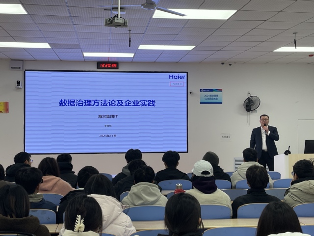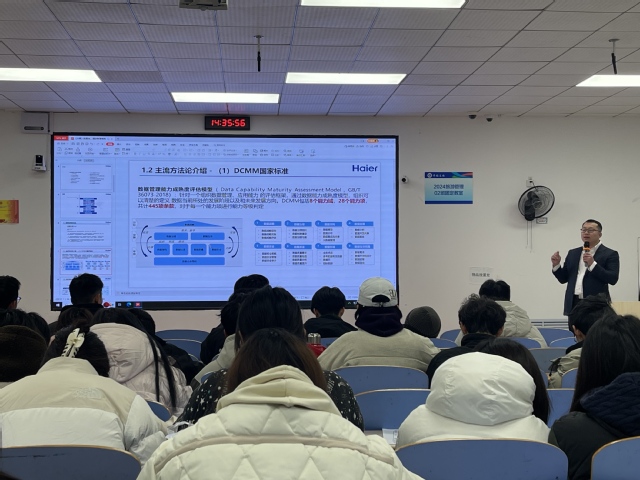 讲坛伊始,李明旭先生首先介绍了数据治理的定义及其重要性。他强调:“数据治理是确保数据质量、实现数据价值的关键,对于企业的数字化转型和智能化升级具有重要意义。”随后,他详细阐述了主流的数据治理方法论,包括DCMM国家标准、华为数据之道以及DAMA框架,并通过丰富的案例分析了这些方法在实际应用中的优势和挑战。此外,李明旭先生还分享了海尔集团在数据治理方面的实践经验。他介绍了海尔集团如何通过构建完善的数据治理体系,实现了数据的标准化、规范化和智能化管理,进而提升了企业的运营效率和决策能力。这些实践经验为在座的师生提供了宝贵的参考和借鉴。