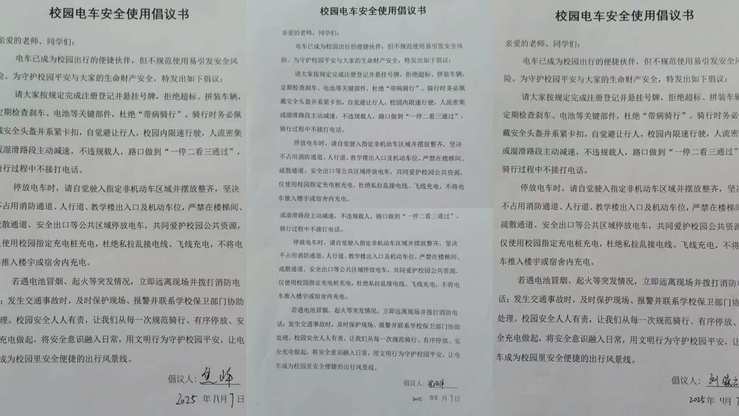 公司向全院持有电动车的员工发出《校园电车安全文明出行倡议书》,明确规范停放、安全骑行、合规充电等要求。倡议得到相关员工广泛响应,大家表示将以实际行动践行倡议,携手守护校园平安。